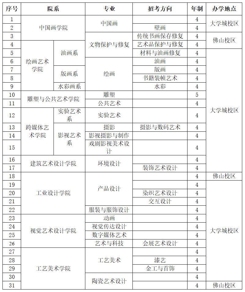 近年来,学校主动适应国家和区域经济社会发展需要,适应知识创新、科技进步以及学科发展需要,结合学校办学定位和办学条件,深入推进学科专业一体化建设,不断优化专业建设机制,提高人才培养质量。学校现有美术学、绘画、雕塑、摄影、书法学、中国画、实验艺术、艺术设计学、视觉传达设计、环境设计、产品设计、服装与服饰设计、公共艺术、工艺美术、数字媒体艺术、艺术与科技、陶瓷艺术设计、戏剧影视美术设计、动画、影视摄影与制作、艺术教育、服装设计与工程、工业设计、建筑学、风景园林、艺术管理26个专业29个专业方向。其中,教育部一流本科专业“双万计划”国家级建设点5个(绘画、雕塑、视觉传达设计、环境设计、产品设计),省级一流专业建设点7个;国家级专业综合改革试点项目专业1个;国家级特色专业4个,省级特色专业8个;省级重点专业2个,省级专业综合改革试点项目6个,省级应用型人才培养示范专业2个,在专业建设上正逐步形成关注社会需求,一流专业为支撑、多学科交叉融合、动态调整的专业发展格局。