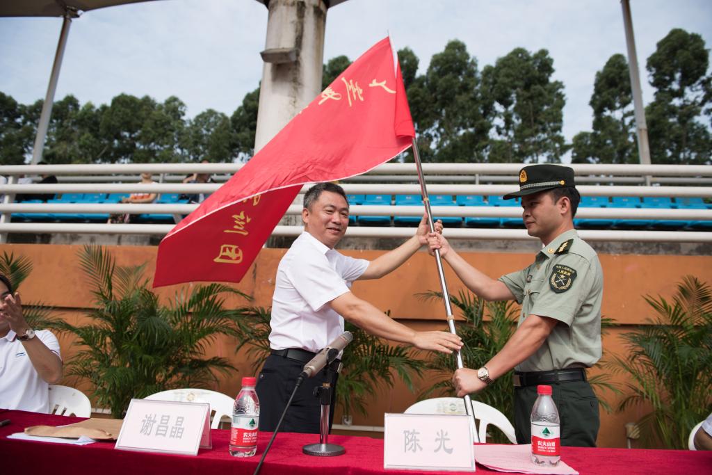 谢昌晶在会上作了军训动员讲话,代表学校向参加军训的全体新同学表示热烈欢迎,向承担我校今年新生军训任务的广东省军区综合训练队和广州市增城区国防教育训练基地的全体教官表示诚挚感谢和崇高敬意。他强调,军训是大学生的必修课,是履行国家法律义务的重要体现,是高校实现立德树人根本任务、培养高素质后备兵员和提高教育质量的重要途径,学校各部门、各单位要各司其责,密切配合,全力保障,确保新生军训工作安全有效开展。他希望承训单位精心组织,按纲施训,确保军训质量。