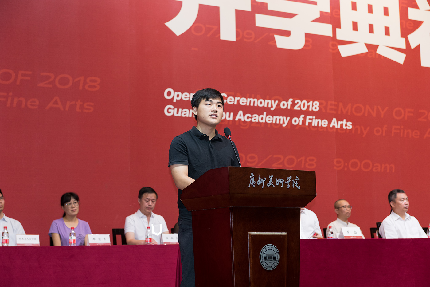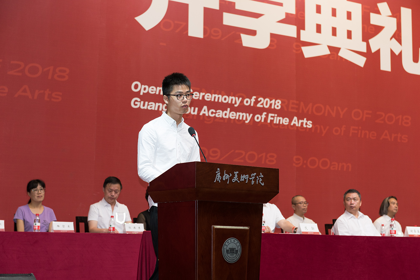 雕塑系2018级周乐代表本科新生发言,感谢师长们的热情关怀,表示将在梦开始的地方努力拼搏,珍惜大学时光,勇往直前,不悔青春。中国画学院2018级罗望超代表研究生新生发言,认为前辈们的薪火相传使广美精神经得起岁月更迭,自己有幸成为新的火种,将深刻领会习近平总书记给中央美术学院老教授的回信精神,用心感受时代,继承广美精神,以大美之艺勇攀艺术高峰。