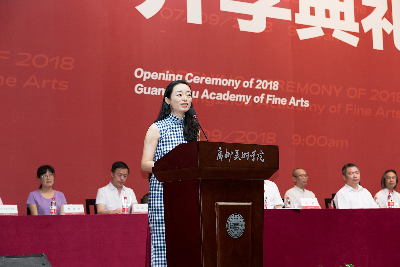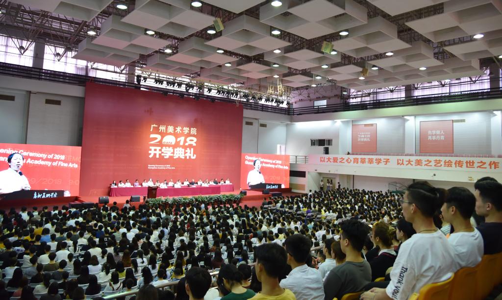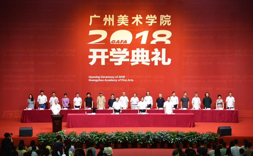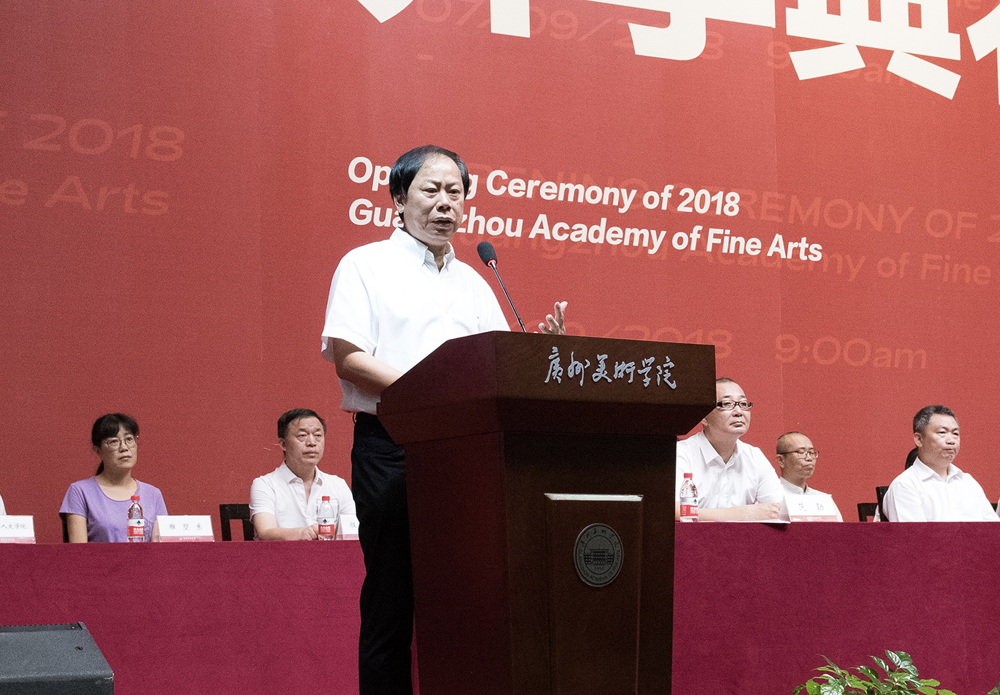 典礼在庄严的国歌声中正式开始,党委书记谢昌晶郑重地为新生代表佩戴校徽,标志着全体新生们正式成为广美学子。李劲堃发表了热情洋溢的致辞,代表学校对2018级新生的到来表示衷心祝贺和热烈欢迎。他以校训“先学做人、再事丹青”激励学生德艺兼修,以我校优良办学传统勉励学生志存高远、笃定而行。他结合“习近平总书记给中央美术学院老教授重要回信”精神,鼓励同学们坚定文化自信,坚持艺术为民,勇于开拓创新,树立崇高艺术理想。他希望同学们通读领会习近平总书记在文艺工作座谈会上重要讲话,以宽广的视野、高远的目标定位自己的艺术人生,并以胡一川、关山月、黎雄才、王肇民、潘鹤、杨之光等岭南大家的艺德人品为榜样,探索自己的艺术道路,严谨治学,坚定、扎实地肩负起文化艺术繁荣发展的未来。