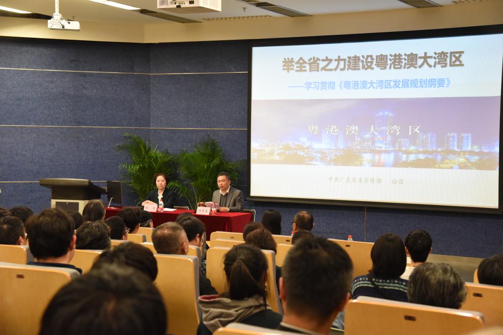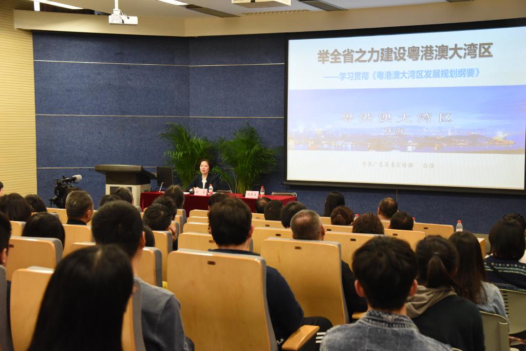 为加强《粤港澳大湾区发展规划纲要》(以下称《规划纲要》)学习宣传,根据中央和省委部署,3月14日下午,我校在大学城校区会议室举行党委中心组学习扩大会,专题学习《规划纲要》,邀请省委宣传部常务副部长白洁同志作专题辅导报告。学校党委书记谢昌晶,院长李劲堃,党委副书记黄启明、穆林,副院长范勃、蔡拥华,党委中心组成员,全体中层干部、聘任制干部,马克思主义学院教师,学生处、团委干部,辅导员,部分学生代表聆听了报告。谢昌晶主持报告会并就学校进一步学习宣传落实《规划纲要》作了部署。