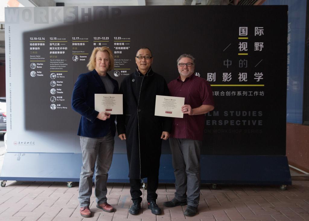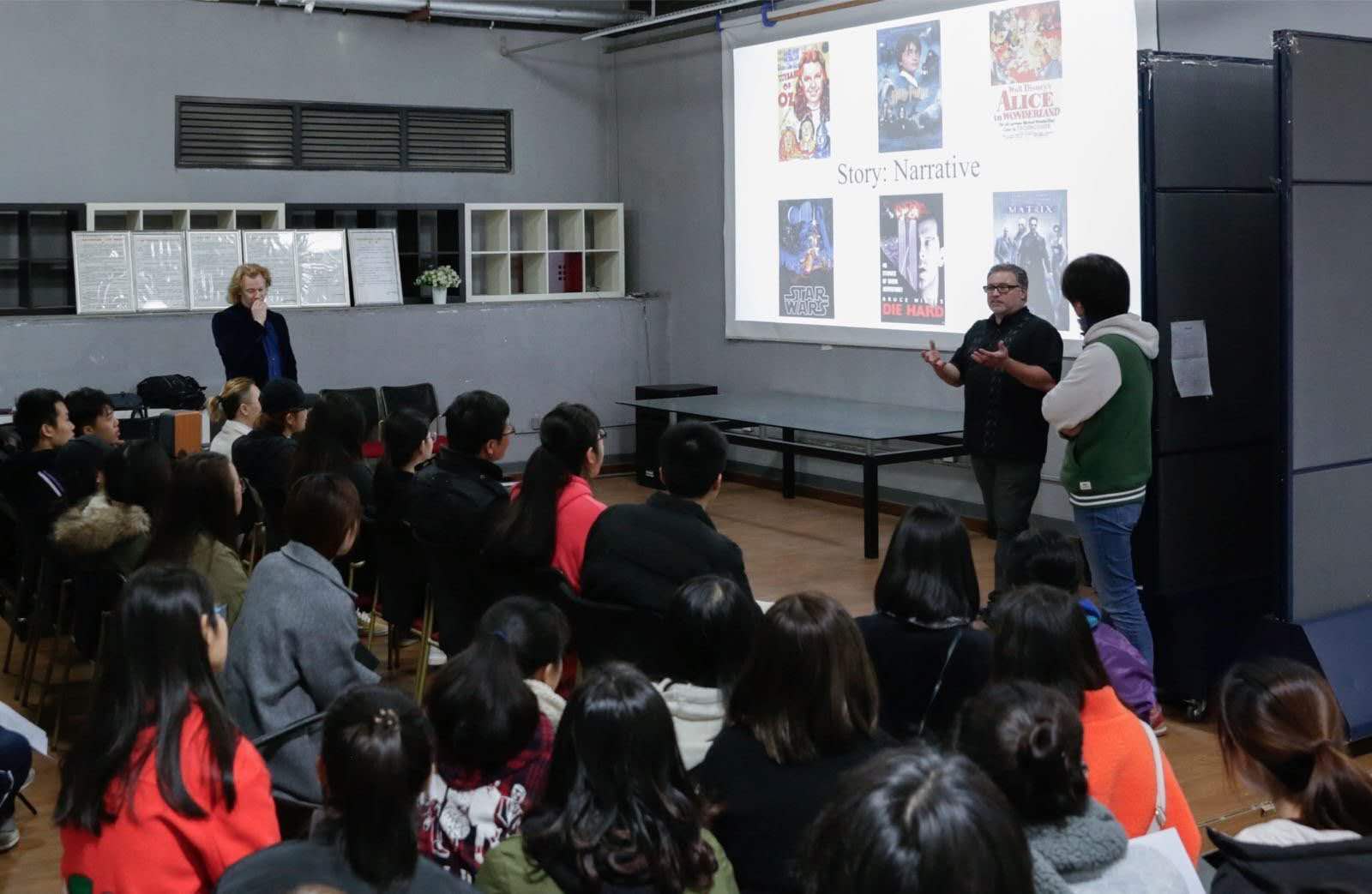 在为期5天的工作坊课程中,两位教授首先从好莱坞经典电影的叙事模式入手,向学生普及了电影编剧过程中常用的故事形态及情节线索,演示了镜头前的导演技巧,详细讲解了导演、演员和摄像师如何在片场完美协作。他们手把手地指导学生处理拍摄现场的表演细节和场面调度等问题,并对学生的每个作品作出了精彩的点评和指导,向学生们颁发了结课证书。在整个课程中,两位教授认真敬业的教学态度和幽默风趣的人格魅力深深感染了师生们,同学们表示意犹未尽、受益良多。