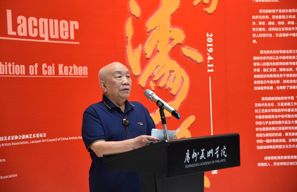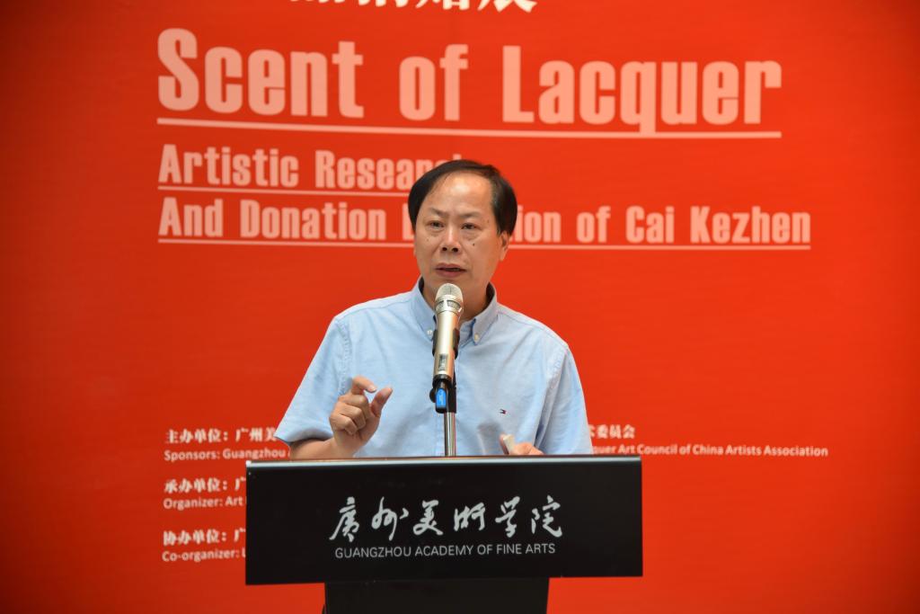 蔡克振先生对学校及展览全体筹备工作人员表示衷心的感谢。他回顾了周恩来总理和胡一川院长的谆谆教导对其人生产生的深远影响,吐露了身为一位艺术家和教育工作者的真挚心声,分享了他为人从艺的心得体会。他认为,将数十年来具代表性的作品捐赠给学校,不仅有利于后学,也是他作品最好的归宿。蔡克振先生表示,中国漆画事业从养在深闺人未知成长至今日的兴旺局面,离不开老一辈漆画家的艰辛创业和新一辈漆画爱好者的参与,他期待中国的漆画事业蒸蒸日上。