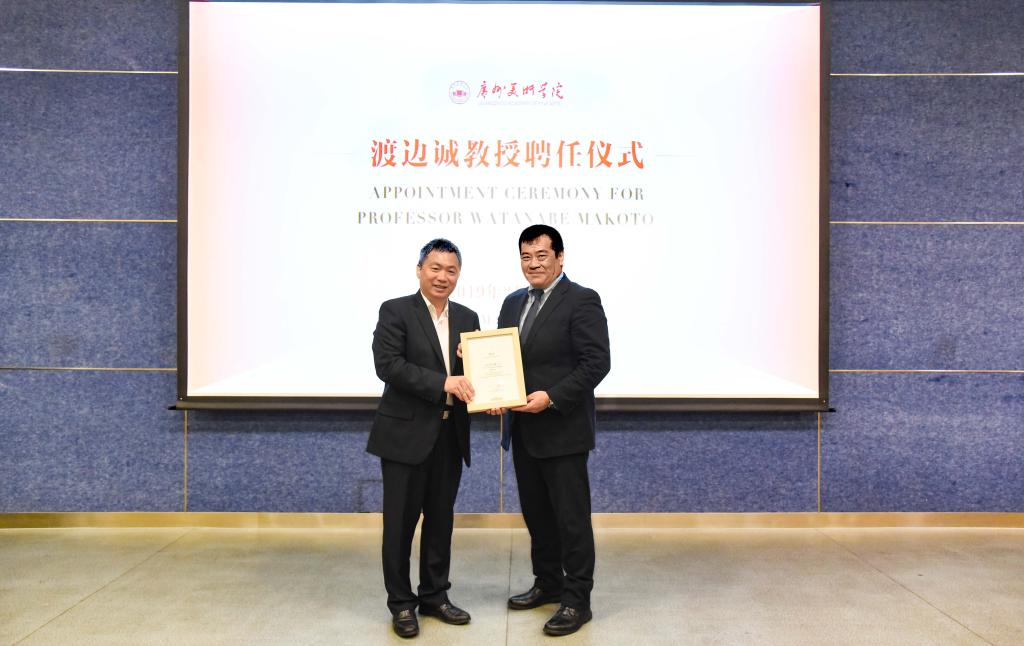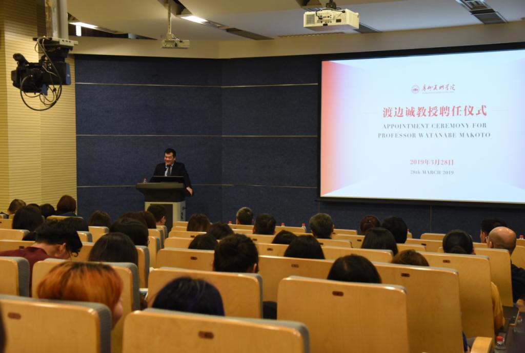 3月28日下午,“渡边诚教授聘任仪式暨学术讲座”在我校大学城校区J栋101课室举行,我校聘任日本千叶大学副校长、博士生导师渡边诚教授为客座教授。学校党委书记谢昌晶、副院长范勃,国际合作与交流处等相关职能部门负责人、二级学院负责人和师生代表出席了聘任仪式。谢昌晶为渡边诚教授颁发客座教授聘书,范勃致欢迎辞,学校人事处处长、绘画艺术学院院长宋光智主持仪式。