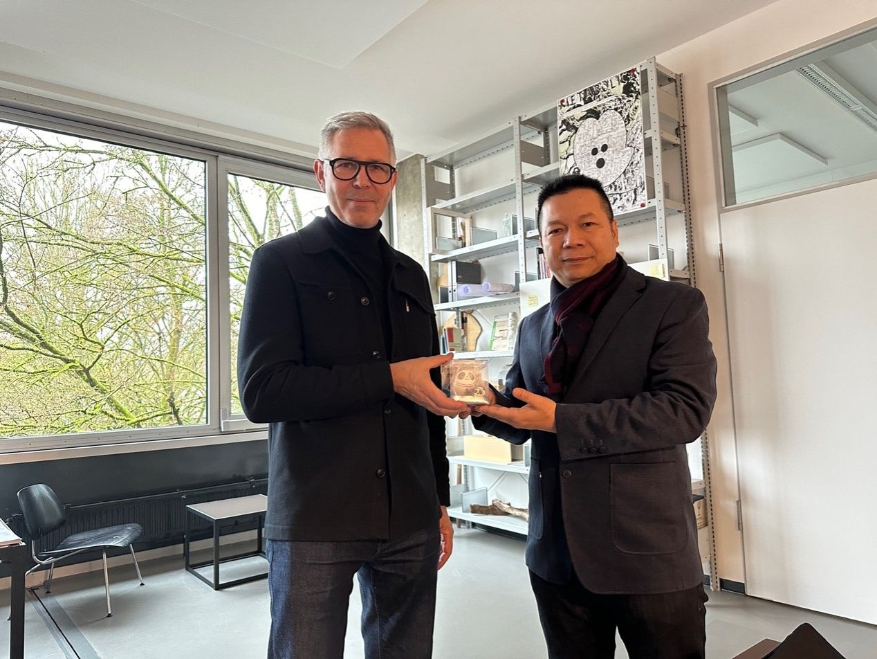 12月6日,访问团一行前往德国卡塞尔艺术学院进行学术访问。卡塞尔艺术学院院长Martin Schmidl教授、视觉设计系负责人Joel Baumann教授等人热情接待了我校访问团。宋光智向卡塞尔艺术学院介绍了近年来我校积极回应科技浪潮和“双区”战略,持续探索艺术高等教育与国家区域社会经济文化发展高度同频、深度共振的创新发展路径。Martin Schmidl介绍了卡塞尔艺术学院造型艺术、视觉传达、产品设计、艺术教育、艺术与科技等领域的发展现状。Joel Baumann介绍了该校如何通过跨学科教学培养学生的系统分析能力,如何锻炼学生以批判性思维研究艺术文化、科学技术和社会市场之间的相互作用。Joel Baumann还特别感谢了在2025新澳门2025免费原料网做讲座时受到的热情接待。