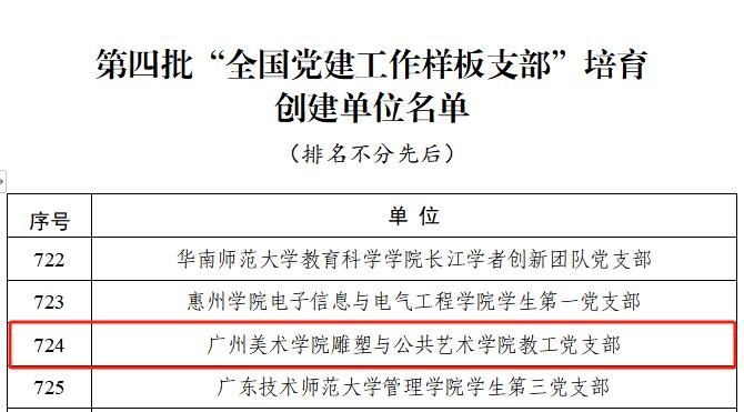 近日,教育部办公厅公布第四批全国党建工作示范高校、标杆院系、样板支部培育创建单位名单。其中,我校雕塑与公共艺术学院教工党支部获批“全国党建工作样板支部”创建单位。