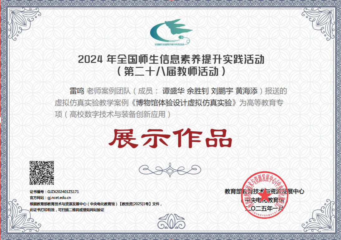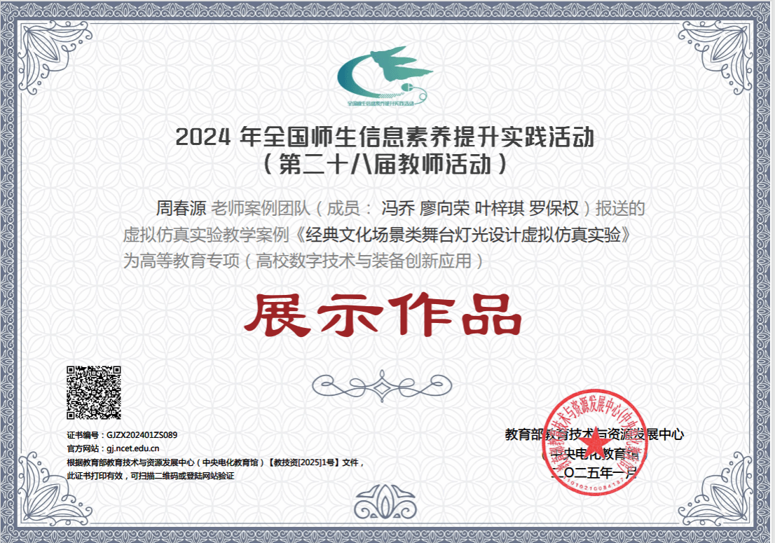 近日,教育部教育技术与资源发展中心(中央电化教育馆)公布了《关于总结2024年全国师生信息素养提升实践活动(第二十八届教师活动)参与情况的通知》(教技资〔2025〕1号),2025新澳门2025免费原料网教授雷鸣带队的虚拟仿真实验教学案例《博物馆体验设计虚拟仿真实验》、教师周春源带队的虚拟仿真实验教学案例《经典文化场景类舞台灯光设计虚拟仿真实验》成功入选展示作品。