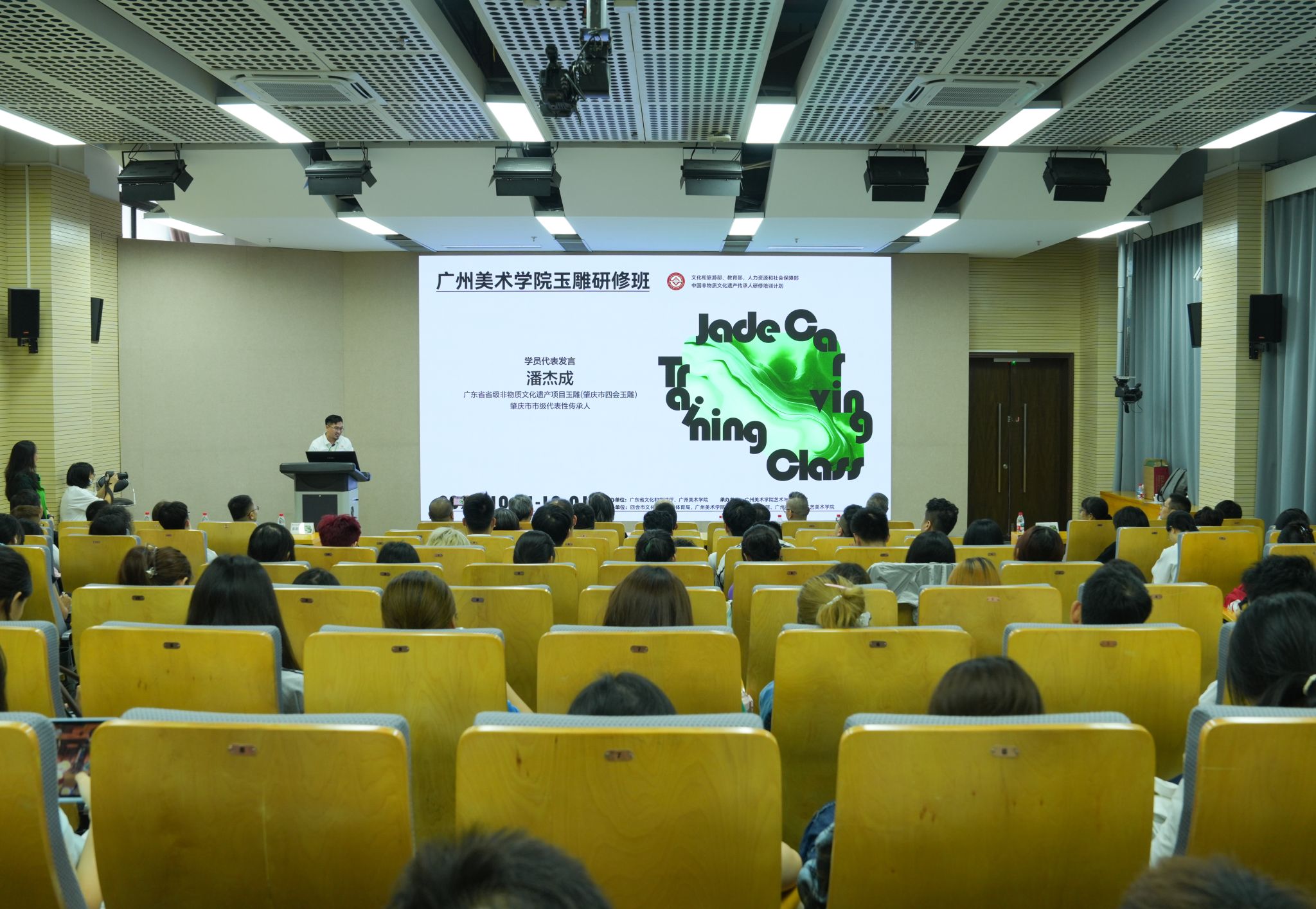 广美2015届校友、广东省省级非物质文化遗产(四会玉雕)肇庆市市级代表性传承人潘杰成作为学员代表发言。他深情回顾在广美求学经历,表示母校所授技艺与精神为他返乡投身玉雕奠定坚实基础。他将此次研修视作“回炉”与升华的契机,期盼在母校学术氛围中激发新思,探索玉雕技艺当代发展路径,并倡议学员互学互鉴,为岭南玉雕传承创新贡献新生代的力量。
