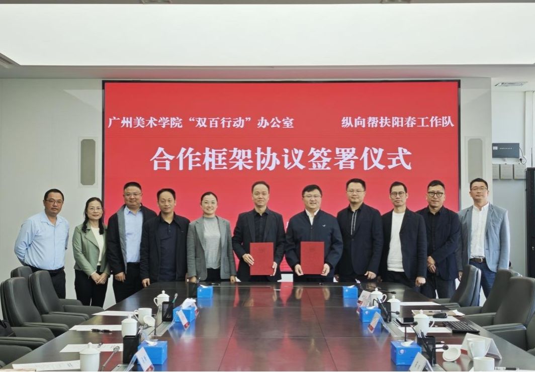 在“双百行动”工作座谈会上,绘画艺术学院林锋教授、褚朱炯副教授详细介绍了阳春民族同心馆民族团结主题画稿创作构思、文化背景、艺术表现与创作进展情况。该画稿系叙事性绘画实验班集体创作,以冼太夫人生平事迹为创作背景,通过艺术手法表现阳春民族风貌与文化底蕴,展示阳春汉俚融合民族团结的光辉事迹。庄灏充分肯定创作团队的展示成果,对文化赋能阳春发展表示感谢,同时要求阳春相关部门加强文化协作,推动广美团队更好完成主题画稿创作工作。随后,林丰、庄灏分别代表学校“双百行动”办公室、省纵向帮扶阳春工作队签署了专项合作框架协议,双方将在文化艺术创作、人才培养、美育浸润、成果转化等多个层面开展深度合作,推动纵向帮扶资源与横向智力资源对接通道,助力阳春文化事业发展。