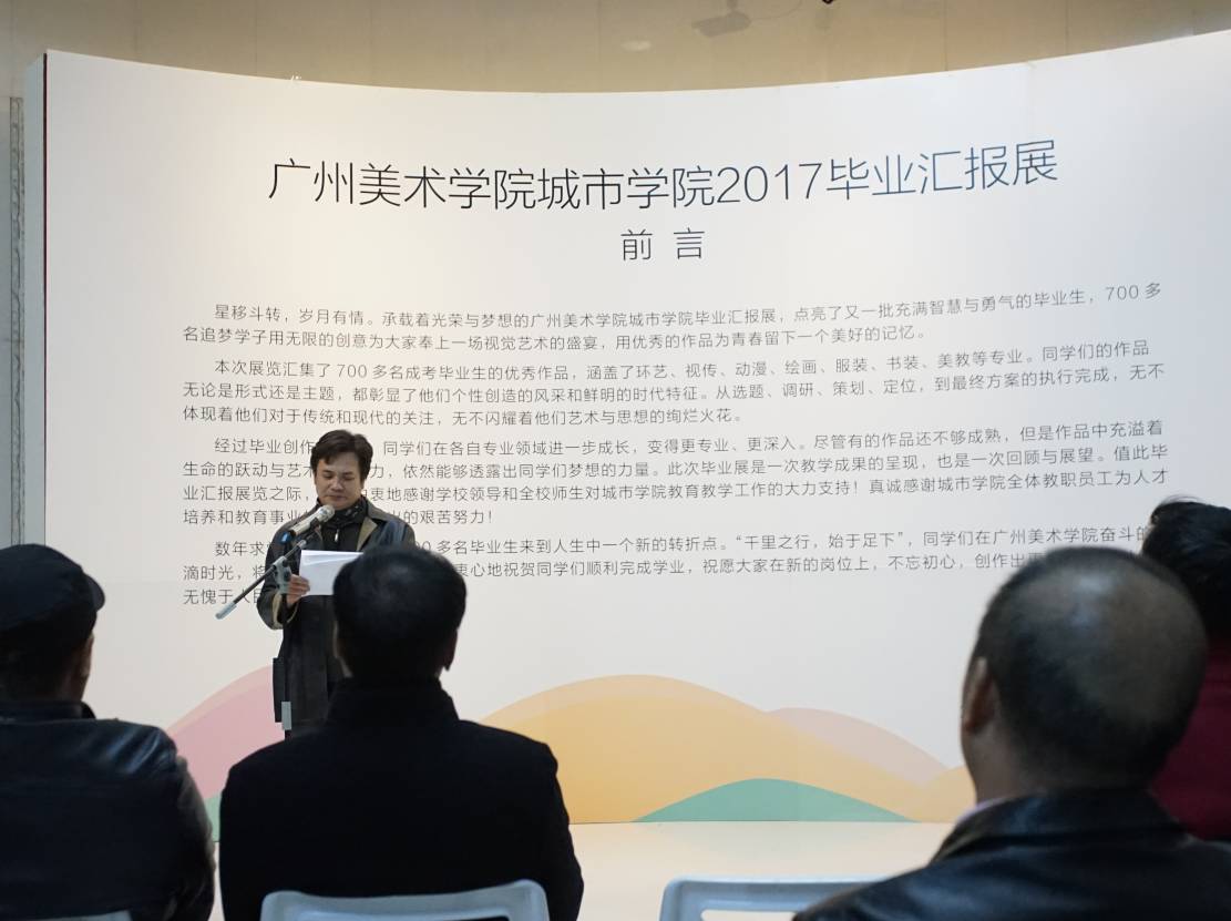 开幕式上,城市学院副院长雷小洲、院长助理李泰山、动漫学部主任叶欢分别致辞。他们对我校成人高等教育近年来良好的发展局面、日益扩大的实训教学平台、逐渐完善的应用型人才培养体系作了介绍。他们表示,城市学院师生坚持以“关注社会、关注民生”为创作导向,希望毕业生在新的岗位上不忘初心,创造出更多无愧于时代、无愧于人民的优秀作品。