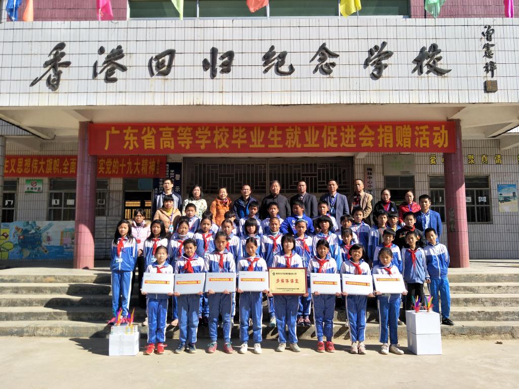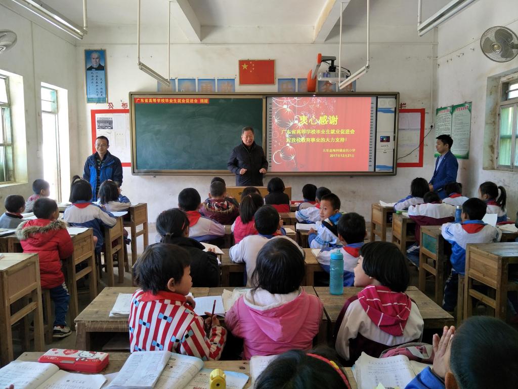 12月21日,学校关工委主任许怀升、委员程秀琼再次到扶贫点五华县梅林镇金坑村支持学校精准扶贫工作。关工委本次联系了广东省高等学校毕业生就业促进会为金坑小学捐赠了4间多媒体教室设备、8台笔记本电脑,价值近12万元。程秀琼个人捐资为金坑小学购买了一批体育用品。此次捐赠大大改善了贫困山区学生的学习条件。