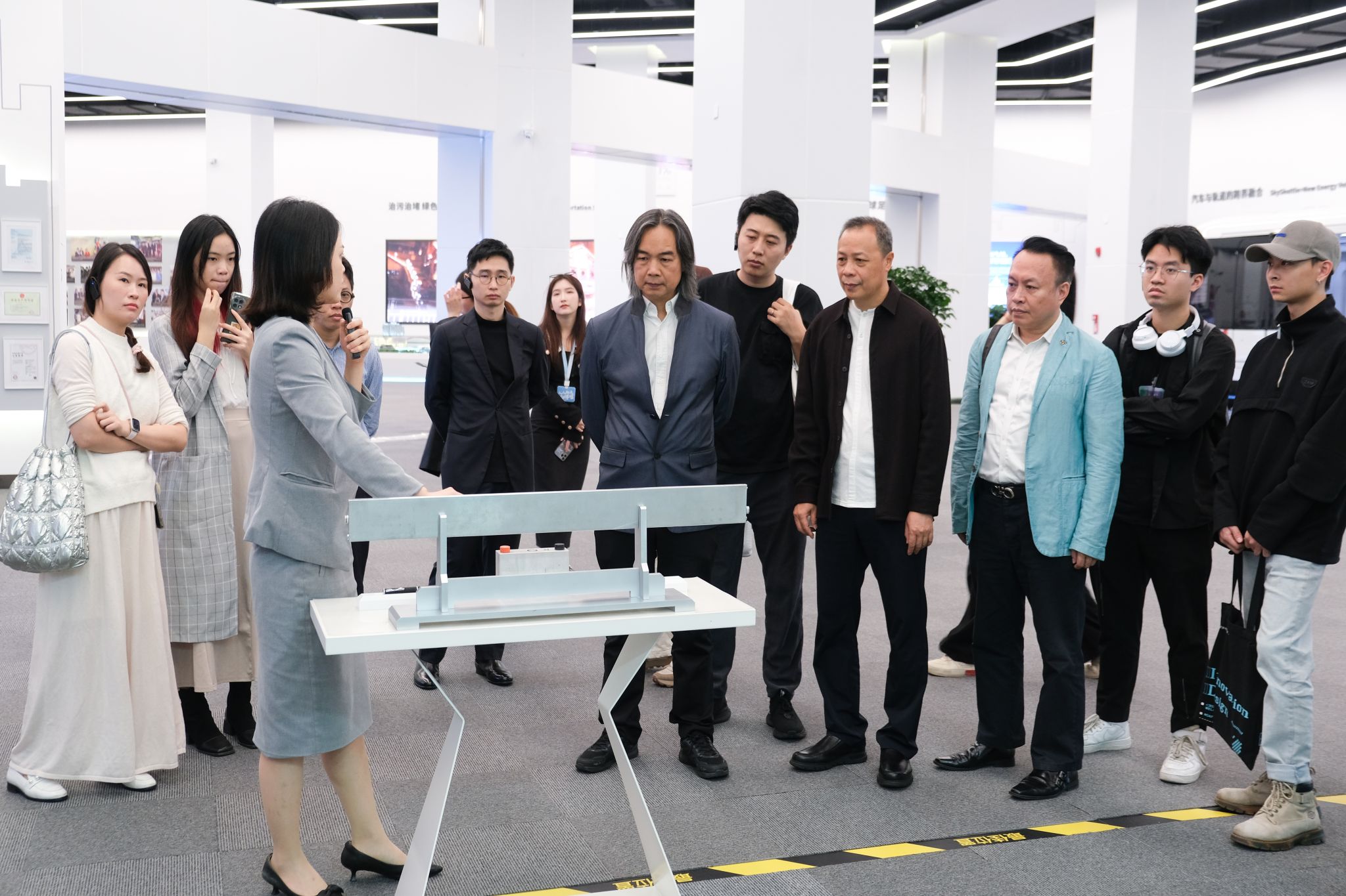 比亚迪品牌营销总监方宁陪同调研团参观了比亚迪集团魔方工作室、轨道交通云巴、刀片电池测试工作室等展示空间,并展开座谈。