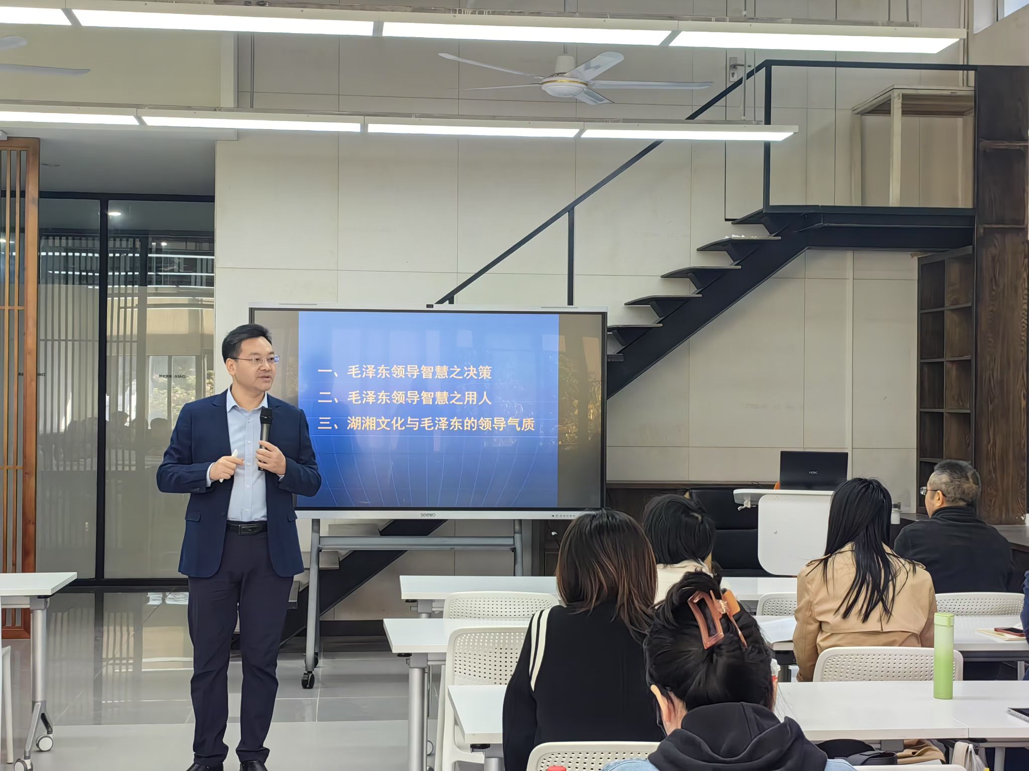 为深入学习贯彻党的二十届三中全会精神,进一步学习把握习近平文化思想的丰富内涵和实践要求,马克思主义学院于11月29日上午在昌岗校区新设计大楼325课室举行专题讲座。教育部青年长江学者、中山大学马克思主义学院副院长兼中共党史党建研究院执行院长张浩教授应邀开讲,主讲题目是《毛泽东的领导智慧》。讲座由马克思主义学院院长徐平华主持,马克思主义学院教师、2024级博士生及学科教学(思政)硕士生聆听了讲座。