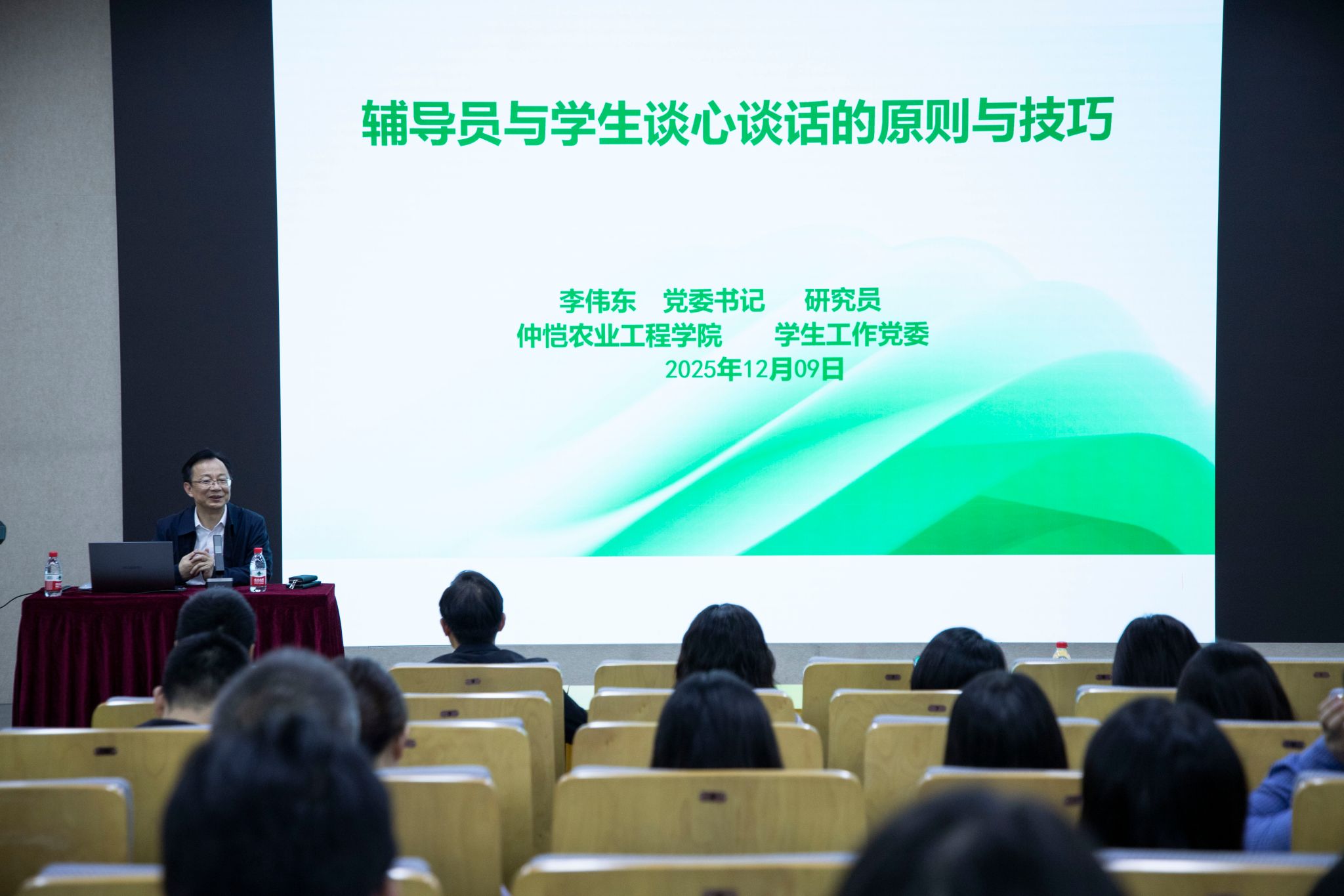 讲堂结束后,孙凯军作总结讲话。他就落实相关工作提出两点要求:一是各二级学院要全面排查分管学生和场地中的安全隐患,重点加强政治安全、反诈宣传、心理健康危机排查和消防安全教育,做到早发现、早干预、早处置,坚决守住校园安全稳定的底线,全方位守护学生生命财产安全和校园和谐稳定;二是全体辅导员要认真消化吸收讲堂内容,将谈心谈话技巧与工作实际紧密结合,切实把学习成果转化为育人实效,为培养德智体美劳全面发展的社会主义建设者和接班人贡献学工力量。
