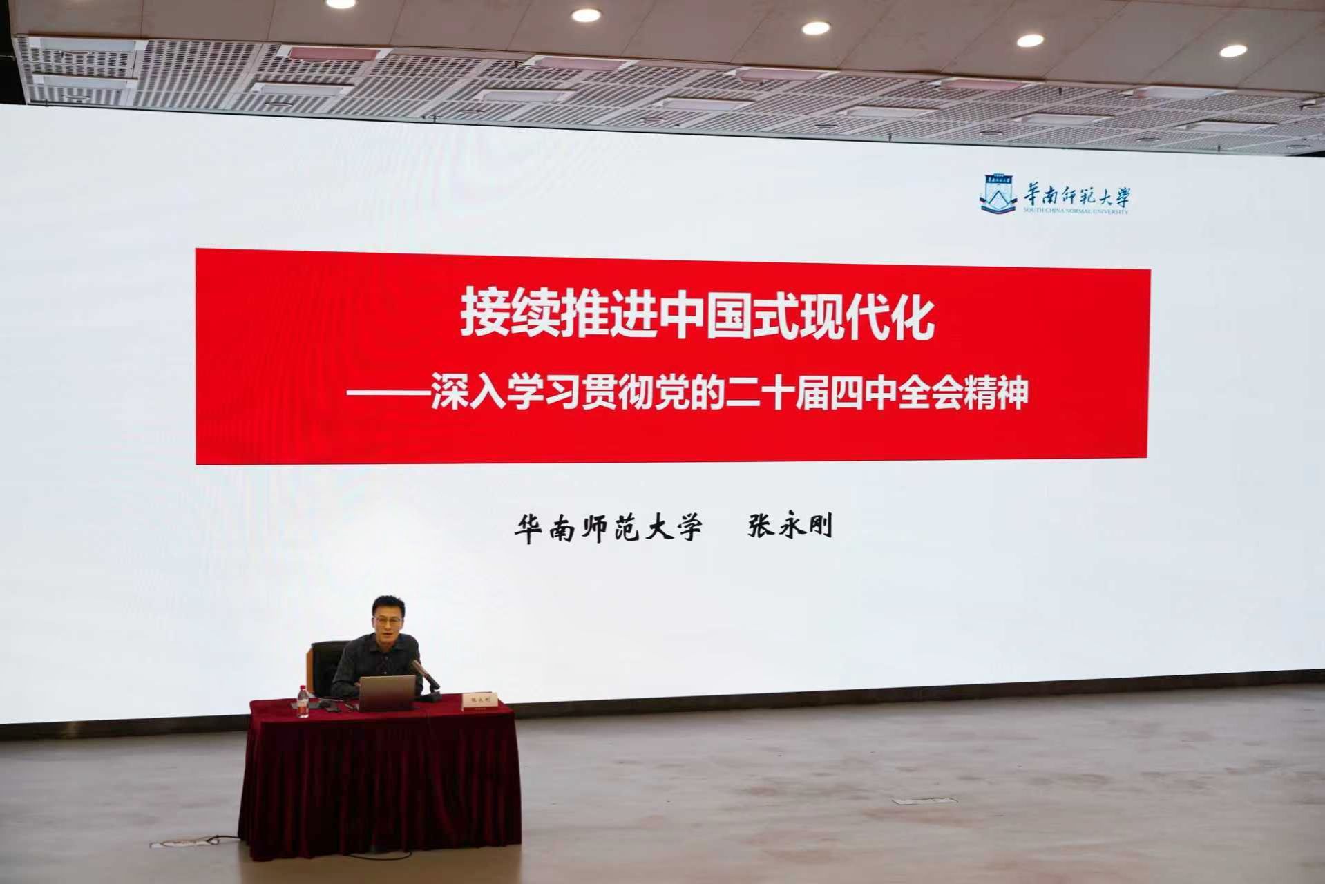 为深入学习贯彻党的二十届四中全会精神,引导广大师生准确把握国家发展大势,自觉将个人的学习、成长及工作融入到党和国家的发展进程中,12月10日,2025新澳门2025免费原料网湾区创新学院、中国画学院、文化遗产保护与管理学院在大学城校区900座报告厅举办“接续推进中国式现代化,深入学习贯彻党的二十届四中全会精神”专题讲座。讲座特邀教育部网络教育名师、团中央青年讲师团成员、华南师范大学马克思主义学院博士生导师张永刚教授主讲,湾区创新学院党总支书记岑君豪、文化遗产保护与管理学院党总支书记张体,党委组织部副部长、党校办公室副主任刁娥凤,中国画学院党总支专职副书记黄素贞,湾区创新学院党总支专职副书记吴东杰,相关学院辅导员、师生党员、重点发展对象、入党积极分子、团委学生会、班委、团员等500余人聆听了讲座。本次讲座是广美学工大讲堂第5讲,也是学校2025年学风建设月系列活动之一。