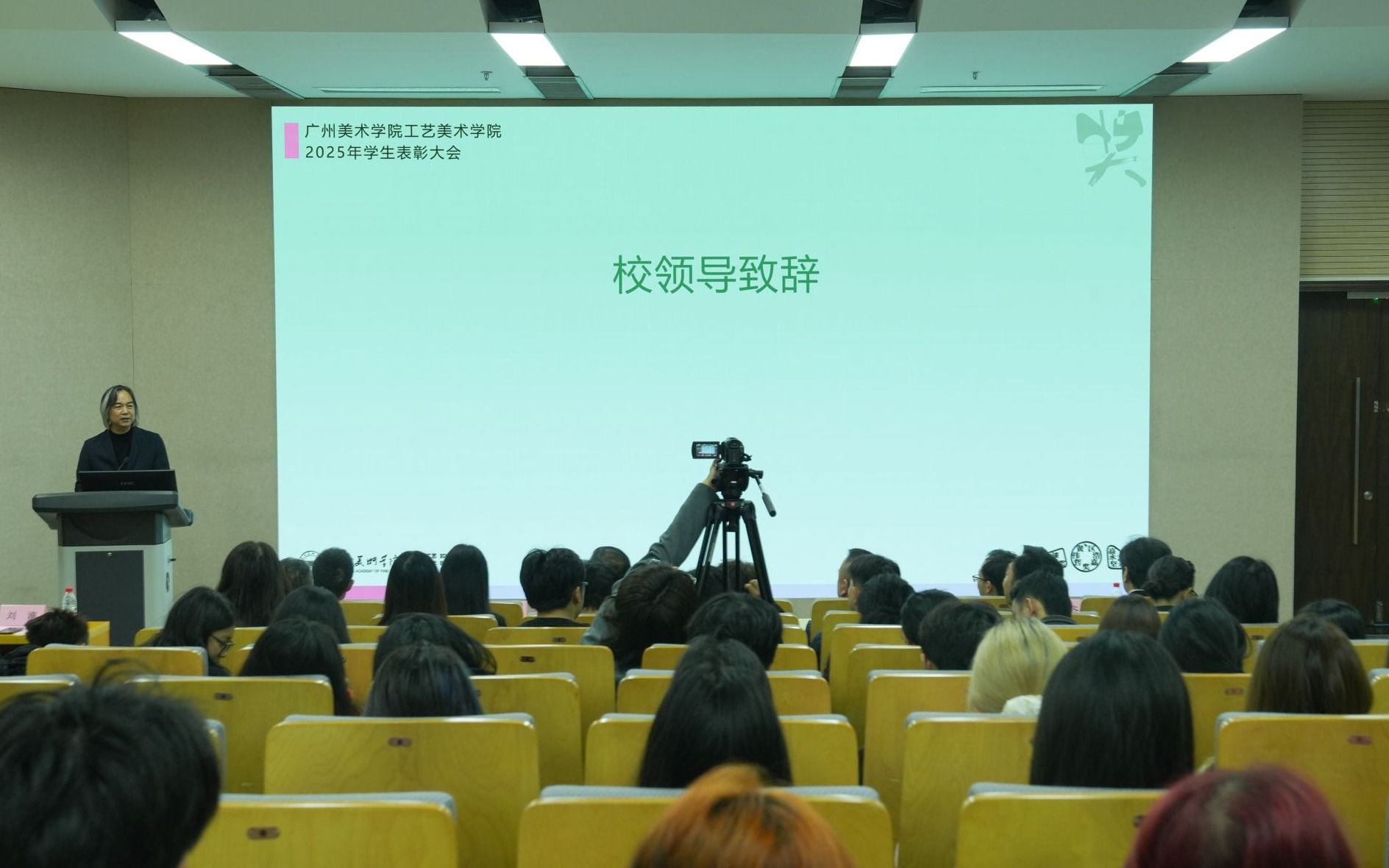 会上表彰了在各类奖项和竞赛中表现突出的个人与集体,包括多项专项奖学金获得者、入选第十四届全国美展的作者、参与第十五届全运会开幕式艺术装置设计的团队,以及在国家级省级展览、团学实践与社会服务中取得佳绩的代表。会上还举行了校外导师聘任仪式,区浩嘉、李润森、黄伟哲受聘为学生创新创业与干部培训指导教师,进一步拓展协同育人平台。