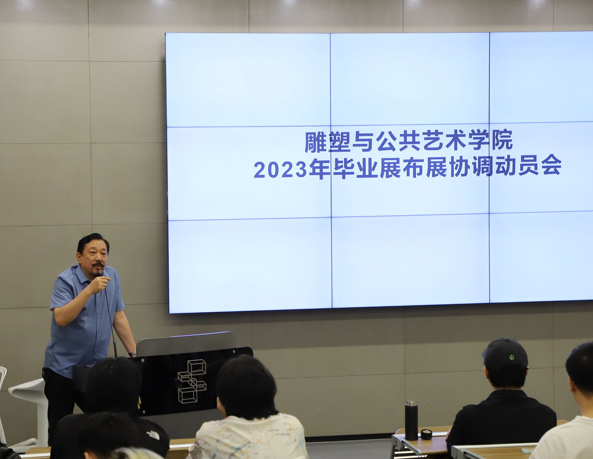 为深入开展学习贯彻习近平新时代中国特色社会主义思想主题教育, 践行“学思想、强党性、重实践、建新功”总要求,5月30日,雕塑与公共艺术学院举办2023年本科毕业创作教学汇看、毕业展布展协调动员会,以主题教育成效推动高质量本科毕业创作教学。党总支书记刘燕平,院长陈克,专职副书记卓国森,副院长张弦、陈宏践,各工作室主任,毕业创作指导教师代表、全体毕业生出席会议。