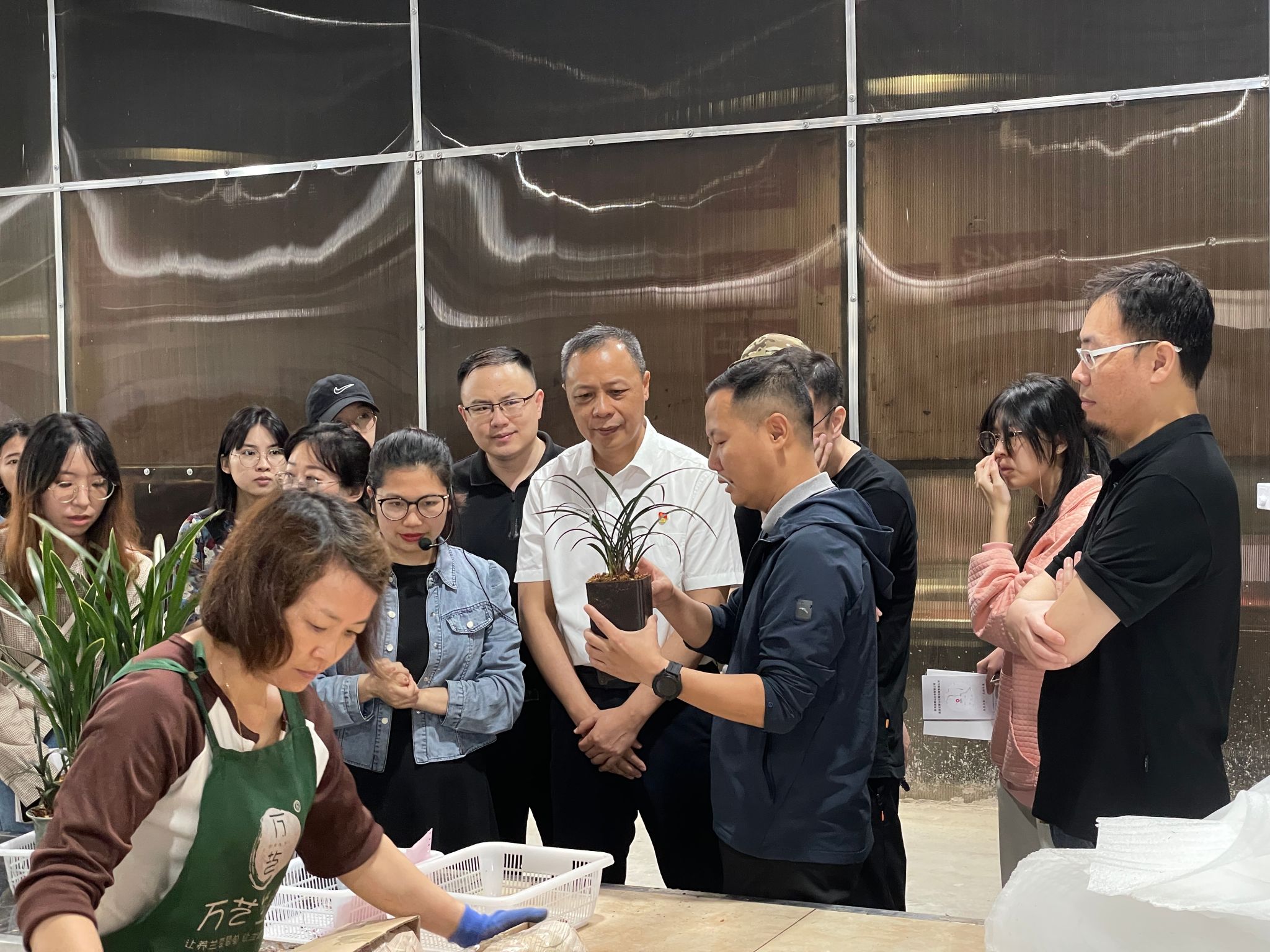 5月11日,师生党员前往翁源县九仙桃示范基地开展调研考察,了解九仙桃的培育、种植、生产等新技术和水果基础设施建设。师生党员来到翁源县万艺电商文创中心,学习兰花种植、培育,观摩兰花电商直播、物流配送等。随后前往珠江源茶厂进行调研考察,了解当地茶旅融合发展路径。师生党员在考察过程中就农产品品牌提升、包装设计、文创产品开发等进行交流研讨。
