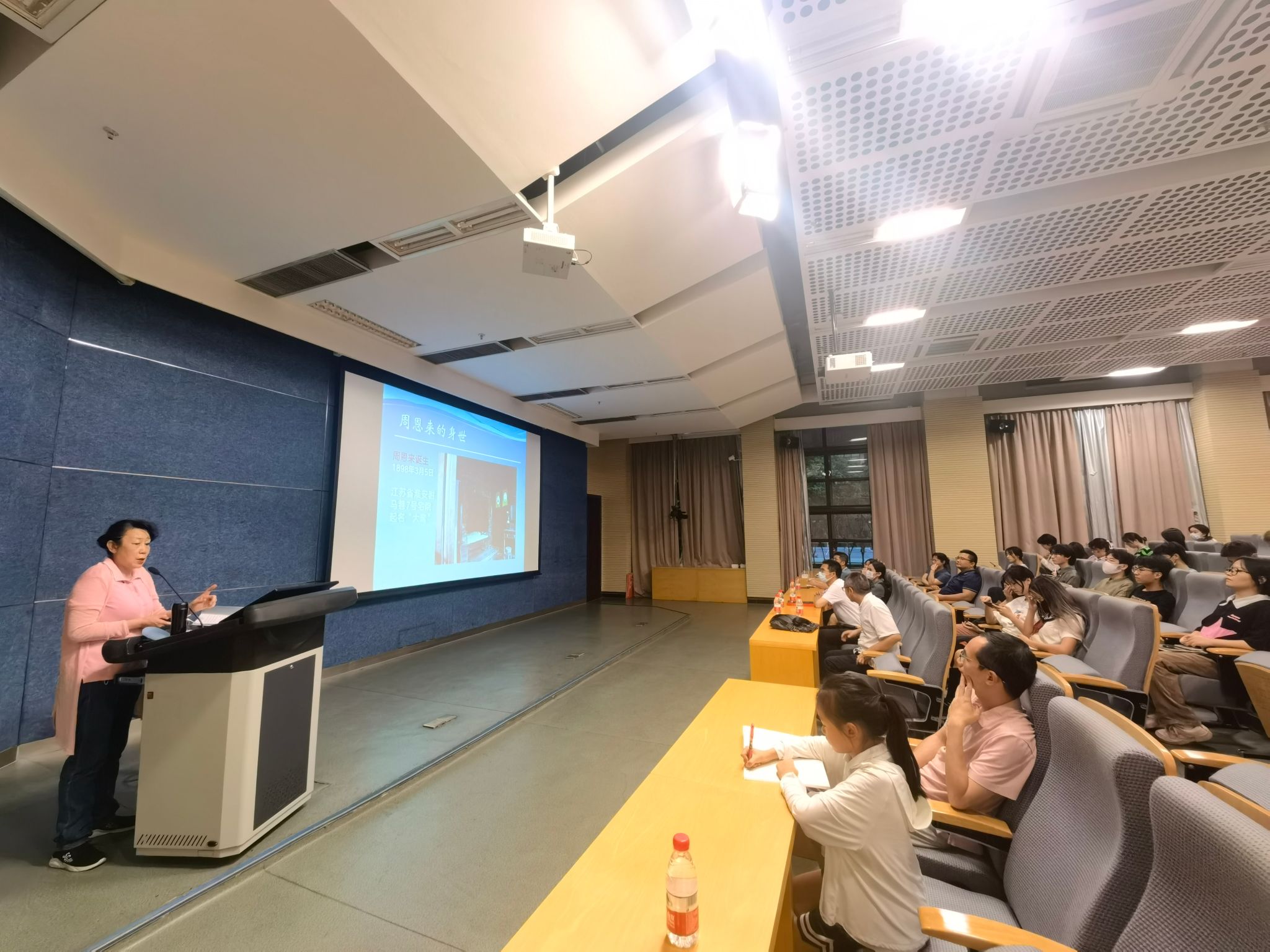周晓瑾以“为中华之崛起而读书”为主题,从“我从小就懂得生活的艰难----周恩来颠沛流离的童年” “影响周恩来命运有哪些因素?”“我们向周恩来学什么?”三方面解读周总理的成长环境、伟大志向,揭示了周总理的人生和革命经历对新时代大学生成长的启发意义。她表示,正是在爱国主义精神激励下,周总理立下“为中华之崛起而读书”的宏志,她鼓励师生们学习周总理的忠孝仁爱之德、坚忍精进的学风、艰苦朴素的作风等优秀品质。周晓瑾还分析了周总理革命爱情观与远大志向的关系,鼓励大学生树立理性、正确的爱情观。周晓瑾在讲座中声情并茂、娓娓道来,引起了广大师生的共鸣。