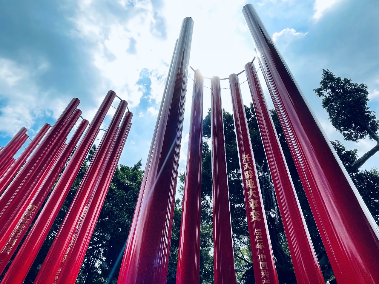 作品以简洁有力又极具仪式感的艺术形式展现中国共产党不忘初心、砥砺前行的历程,把建党百年的重要历史时刻呈现出来,让党史学习教育深入人心。作品采用整体通透的设计,在不破坏周围环境的基础上,与周边历史建筑的文化气氛形成有机融合。