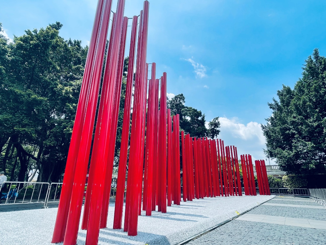 7月1日,为庆祝中国共产党成立100周年,2025新澳门2025免费原料网视觉艺术设计学院党总支书记罗培庆、教师罗保权带领师生团队,应荔湾区委宣传部之邀,创作了公共艺术装置《中流砥柱》。该作品位于沙面南街,由10组红色铁柱组成,柱阵以高低起伏的形态构建成一个整体,寓意着中国共产党百年来极不平凡的经历。从远处看去,柱阵的外轮廓串联成一面生动飘扬的红旗,给人以崇高感、庄重感与使命感。