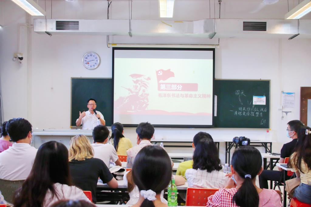 课上,吴慧平以毛泽东书法作品的欣赏为主线,将毛泽东书法风格的演变与其伟大的革命历程串联起来,讲述了每幅代表作品背后的红色故事。吴慧平指出,毛泽东书法作品真实反映了其光辉的人生经历与革命历程,记录着中国共产党建设发展的历史。不同于传统书法家的纯粹艺术创作,毛泽东的书法无论从题材、内容还是形式均包含深刻的革命精神,有其独特的政治意义。他指出,毛泽东对书法的态度与他一贯的革命精神相呼应,其书法风格随着中国革命与社会主义建设历程而发生相应变化,他的作品化为无形的力量,在革命斗争和社会建设中发挥了重要作用。