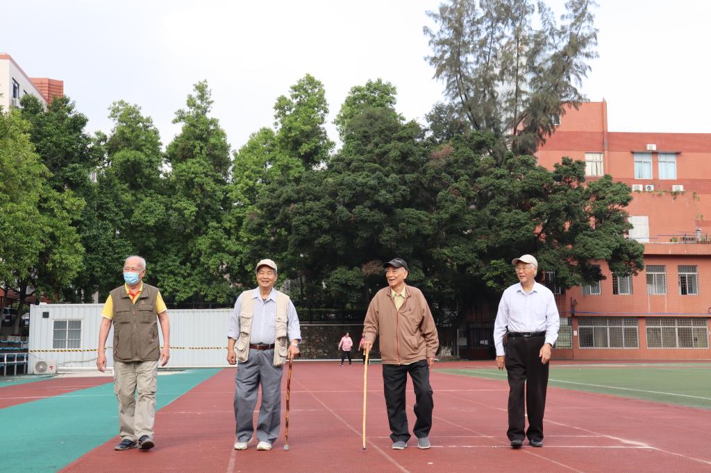 上午八点后,前来参加活动的老同志们陆续到场,个个精神矍铄,热情高涨。测温后,老同志们伴随着激昂欢快的音乐声,以昂扬的姿态,迈着轻松矫健的步伐,沿着田径场跑道健步走。在阳光下,老同志们结伴同行,谈笑风生,共话家常,不时驻足拍照留下快乐的身影,现场欢声笑语不断。