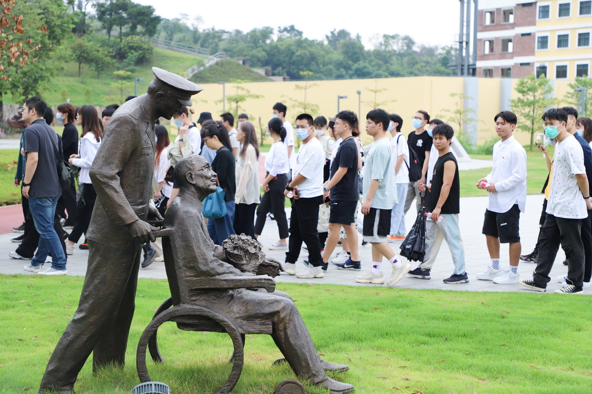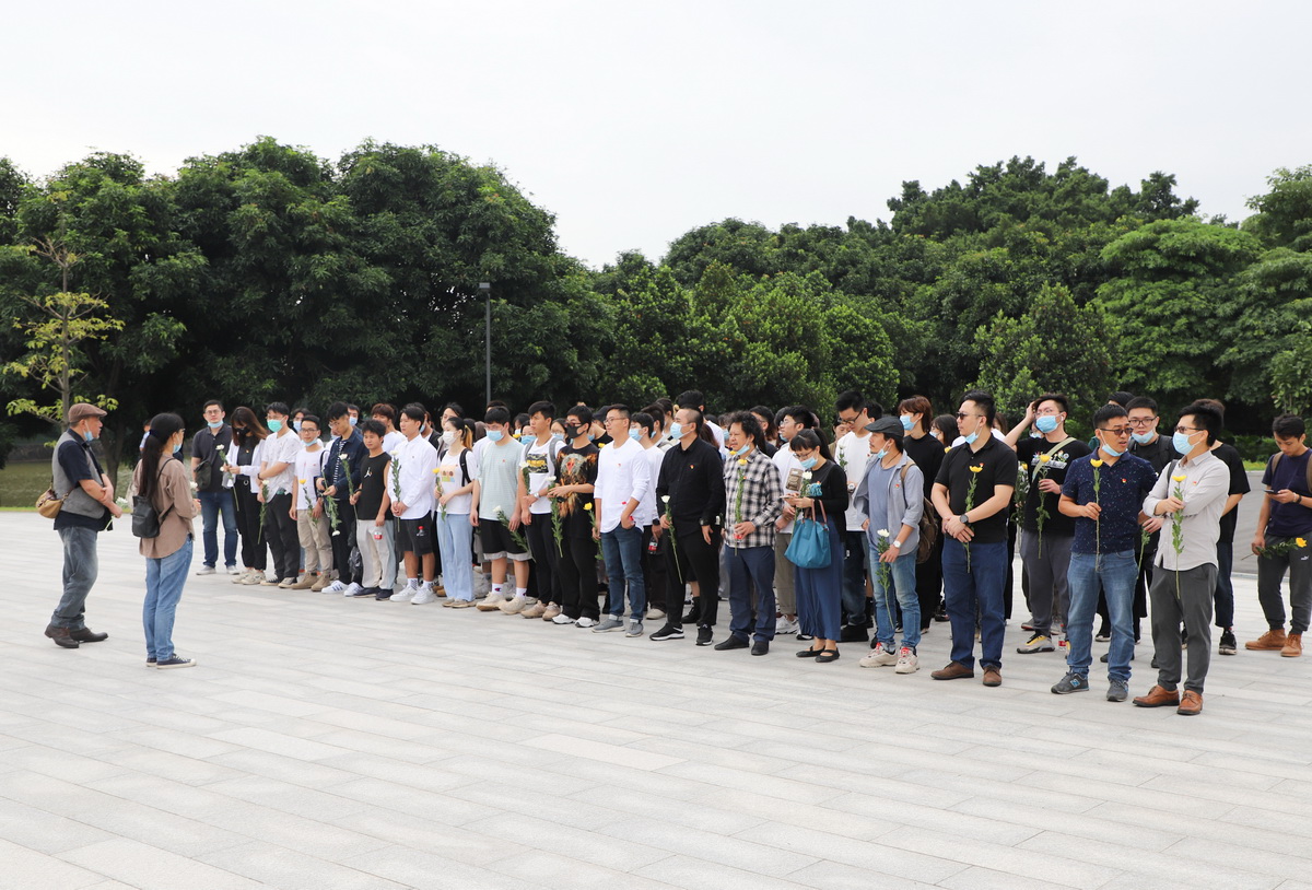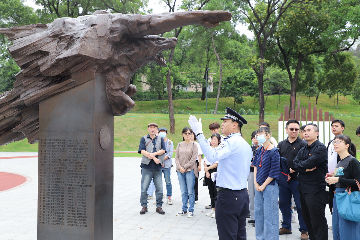 师生们在广东公安民警培训中心工作人员的导览讲解中,了解了广东公安为维护社会治安、保障公共安全舍己奉献的感人事迹。师生们在《英雄墙》与主广场纪念碑围合成的静思空间里,沉静地追思,深切地缅怀,并向英雄先烈敬献了鲜花。