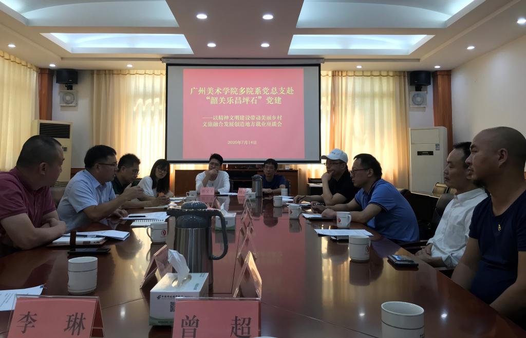 7月14日上午,广美一行参加由韶关乐昌市副市长邓洪炜主持召开的“以精神文明建设带动美丽乡村文旅融合发展创造地方就业座谈会”,就挖掘华南研学基地教育救国红色基因和美丽乡村人文风貌编写本土特色艺术教材、以艺道游学活动助力坪石建设、以艺术教育助力留守儿童身心健康成长及定向培养美术教育乡村师资等内容进行了交流。