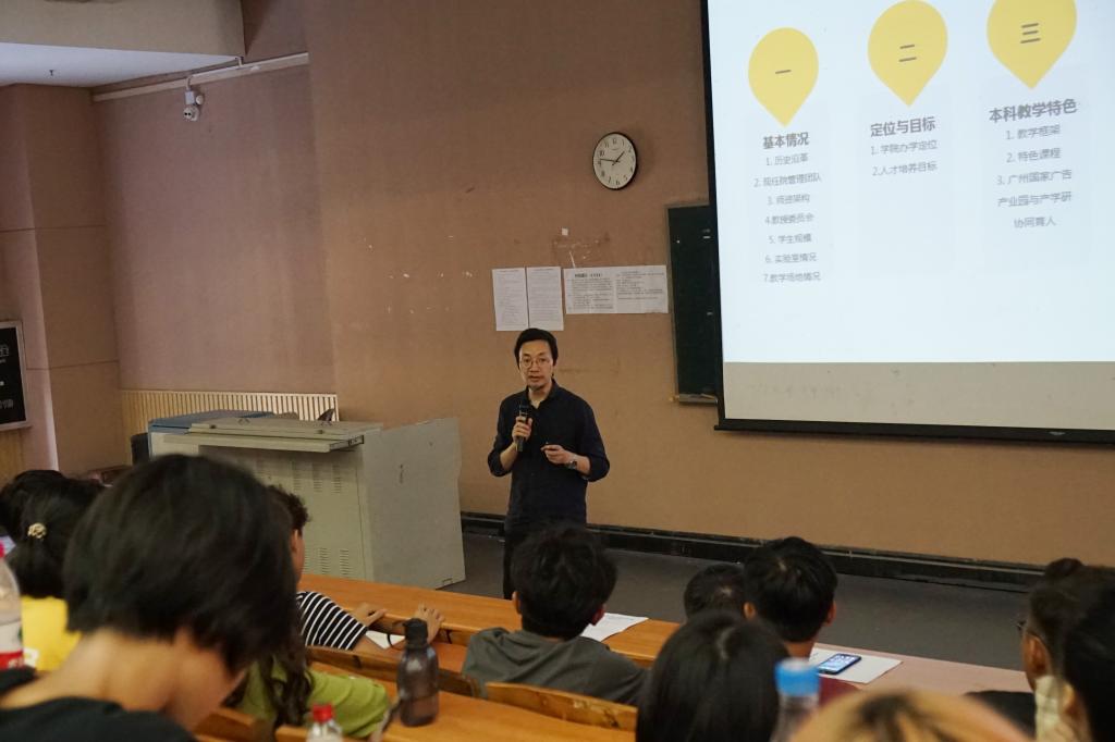曹雪为新生介绍学院的总体情况。他分别围绕学院历史沿革、师资情况、学生规模、教学场地、办学定位与目标等内容作了详细的介绍。在关于人才培养目标方面,他希望在未来的教学中,学生能够跨出专业范畴,构筑更为全面的知识体系。
