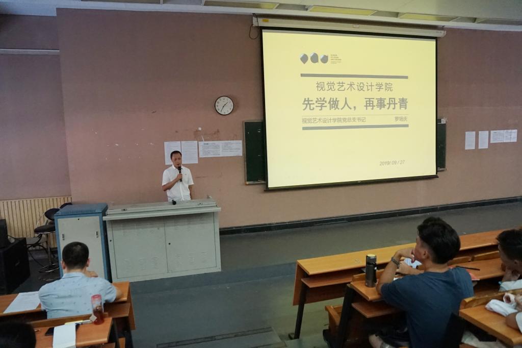 9月27日,视觉艺术设计学院在大学城校区召开了2019级新生见面会暨专业介绍会,视觉艺术设计学院党总支书记罗培庆、院长曹雪、党总支副书记雷鸣、副院长冯乔、各专业委员会主任、办公室老师及全体2019级新生参加会议。