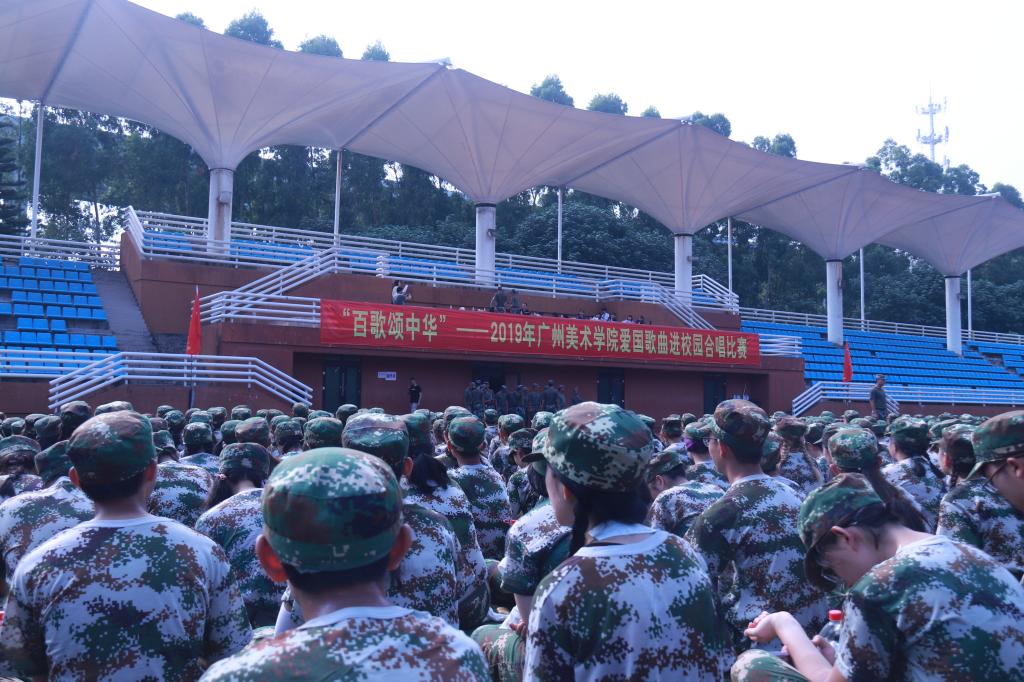 沸腾的绿茵操场上,是满怀深情的广美学子。新生们以军训训练营为单位,依次演唱歌曲《我和我的祖国》,他们用慷慨激昂的歌声讴歌青春、吐露情怀;他们以心潮澎湃的热情祝福中国、畅想未来。
