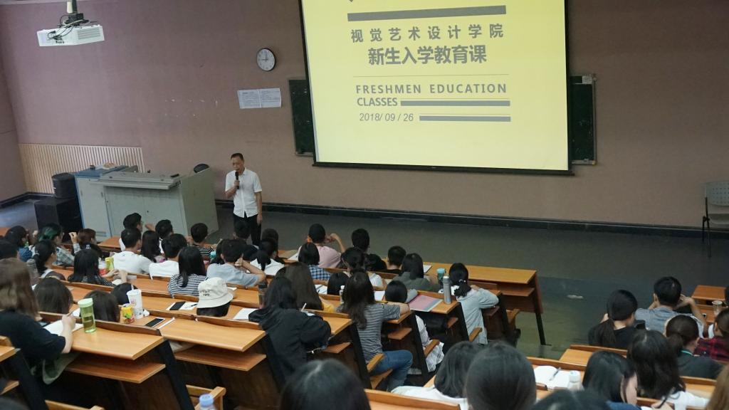 9月27日、9月28日、10月10日,视觉艺术设计学院在我校大学城校区北阶梯课室举行2018级本科新生入学教育系列讲座,活动围绕“启蒙·明志”主题,分别邀请了视觉艺术设计学院党总支书记罗培庆、院长曹雪、副院长冯乔为新生授课。