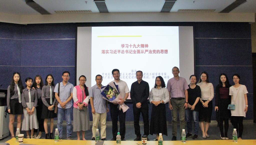 为深入学习贯彻党的十九大精神,更好地帮助师生党员深入理解习近平总书记全面从严治党的思想,5月9日晚上,我校建筑艺术设计学院特邀中共广东省委党校党史党建部教授张浩到大学城校区J101课室讲授专题党课。建筑艺术设计学院党总支书记何争,视觉艺术设计学院党总支书记罗培庆,教工党支部教师代表,辅导员及学生入党积极分子、团学干部等参加了本次活动。
