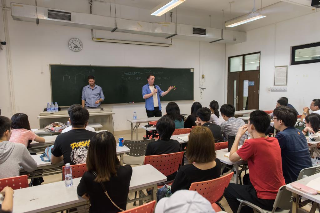 Bob和Darren首先围绕“故事人物”(Story from Character)开展了影视专业主题讲座,分享了在众多创作实践中总结的经验和技巧,深入剖析了电影角色在电影中的作用,并以具体形象的例子解说了故事主旨和情节创作,讲解了制作出色的剧本、电影成品的手段。创作实践环节中,同学们分成9个小组分别扮演导演、编剧、演员、摄影师等角色,共同构思故事情节并外出取景拍摄。两位老师对同学们创作的成品逐一点评并给予修改意见,深化学生对知识的理解,更好地运用所学技巧。