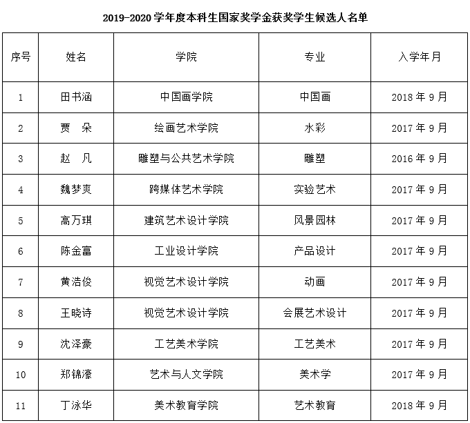 根据广东省教育厅有关通知和《本专科生国家奖学金评审办法》,经学生个人申请、二级学院评选推荐、学生处审核、学校评审委员会评审,拟推荐田书涵等11位同学为我校2019-2020学年度本科生国家奖学金获奖候选人。