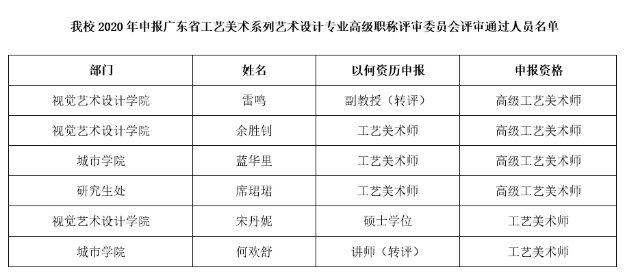 我校雷鸣、余胜钊、蓝华里、席珺珺、宋丹妮、何欢舒6名同志已通过2020年度广东省工艺美术系列艺术设计专业高级职称评审委员会评审,拟获得其申报的职称,现予公示。公示时间从2021年1月5日至1月11日止。