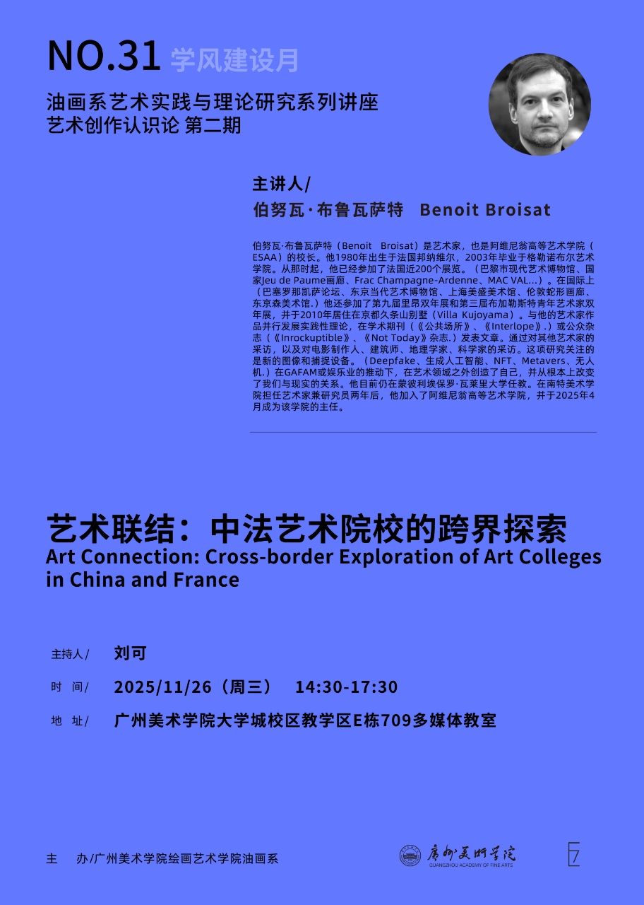 伯努瓦·布鲁瓦萨特(Benoit Broisat)是艺术家,也是阿维尼翁高等艺术学院(ESAA)的校长。他1980年出生于法国邦纳维尔,2003年毕业于格勒诺布尔艺术学院。从那时起,他已经参加了法国近200个展览。(巴黎市现代艺术博物馆、国家leu de Paume画廊、Frac Champaqne-Ardenne、MAC VAL...)。在国际上(巴塞罗那凯萨论坛、东京当代艺术博物馆、上海美盛美术馆、伦敦蛇形画廊、东京森美术馆.)他还参加了第九届里昂双年展和第三届布加勒斯特青年艺术家双年展,并于2010年居住在京都久条山别墅(Villa Kujoyama)。与他的艺术家作品并行发展实践性理论,在学术期刊(《公共场所》、《Interlope》.)或公众杂志(《Inrockuptible》、《Not Today》杂志.)发表文章。通过对其他艺术家的采访,以及对电影制作人、建筑师、地理学家、科学家的采访。这项研究关注的是新的图像和捕捉设备。(Deepfake、生成人工智能、NFT、Metavers、无人机.)在GAFAM或娱乐业的推动下,在艺术领域之外创造了自己,并从根本上改变了我们与现实的关系。他目前仍在蒙彼利埃保罗·瓦莱里大学任教。在南特美术学院担任艺术家兼研究员两年后,他加入了阿维尼翁高等艺术学院,并于2025年4月成为该学院的主任。