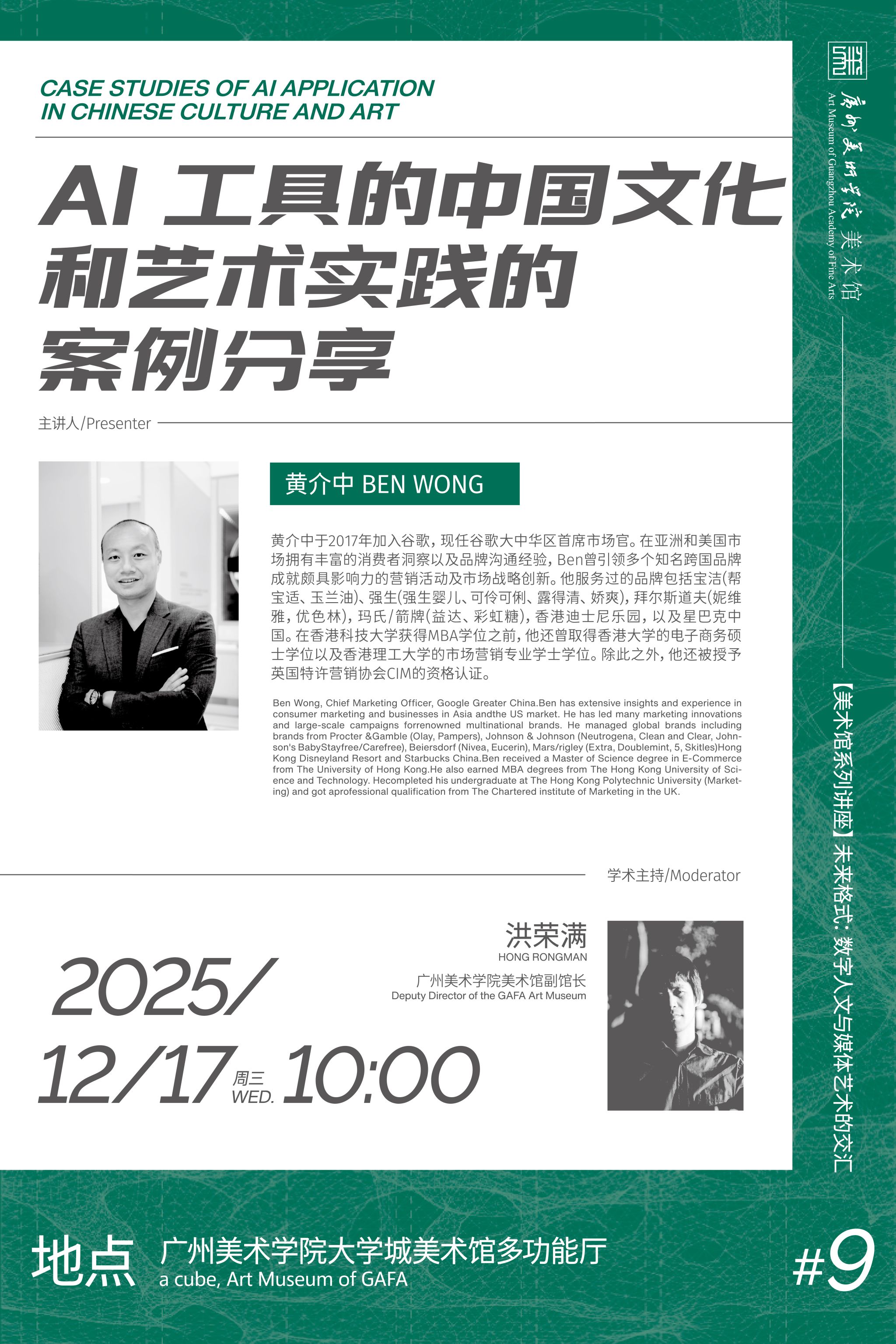 讲座简介:讲座将以AI赋能未来作为切入点,以艺术家邬建安与谷歌软件工程师合作的项目《72变》、敦煌壁画和多模态数据库的大语言模型训练等使用AI技术的文化生产为案例,讨论AI技术与文化艺术结合的未来可能。