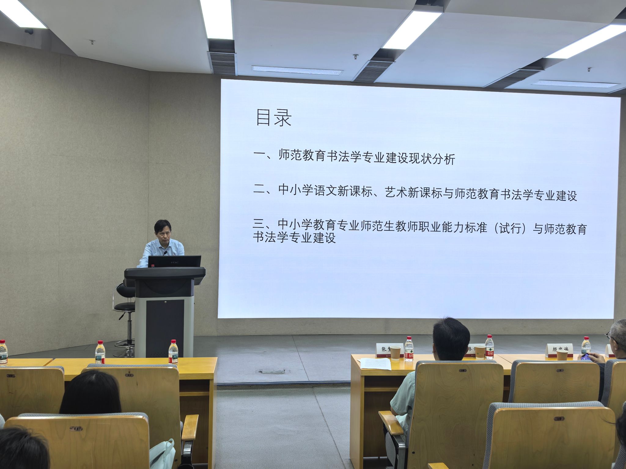 潘善助在讲座中系统分析了全国师范教育书法学专业的发展现状,指出在高等教育综合化背景下,专业建设需进一步强化师范特色,并加强课程体系与中小学教学实际需求的衔接。针对2022年版义务教育课程方案,他强调中小学书法教育应以夯实书写基本功为核心,建议师范院校书法专业优化课程结构,增加楷书、行书技法比重,并将硬笔书法设为必修课,以提升师范生的教学适配能力。此外,潘善助结合《中小学教育专业师范生教师职业能力标准(试行)》,从师德践行、教学实践、综合育人和自主发展四大能力出发,提出应从入学起强化教师职业信念,筑牢“三字一话”基本功,构建贯穿全程的教育实践教学体系,并注重教育教学研究方法的培养,从而培育具备持续发展素养的书法教师。