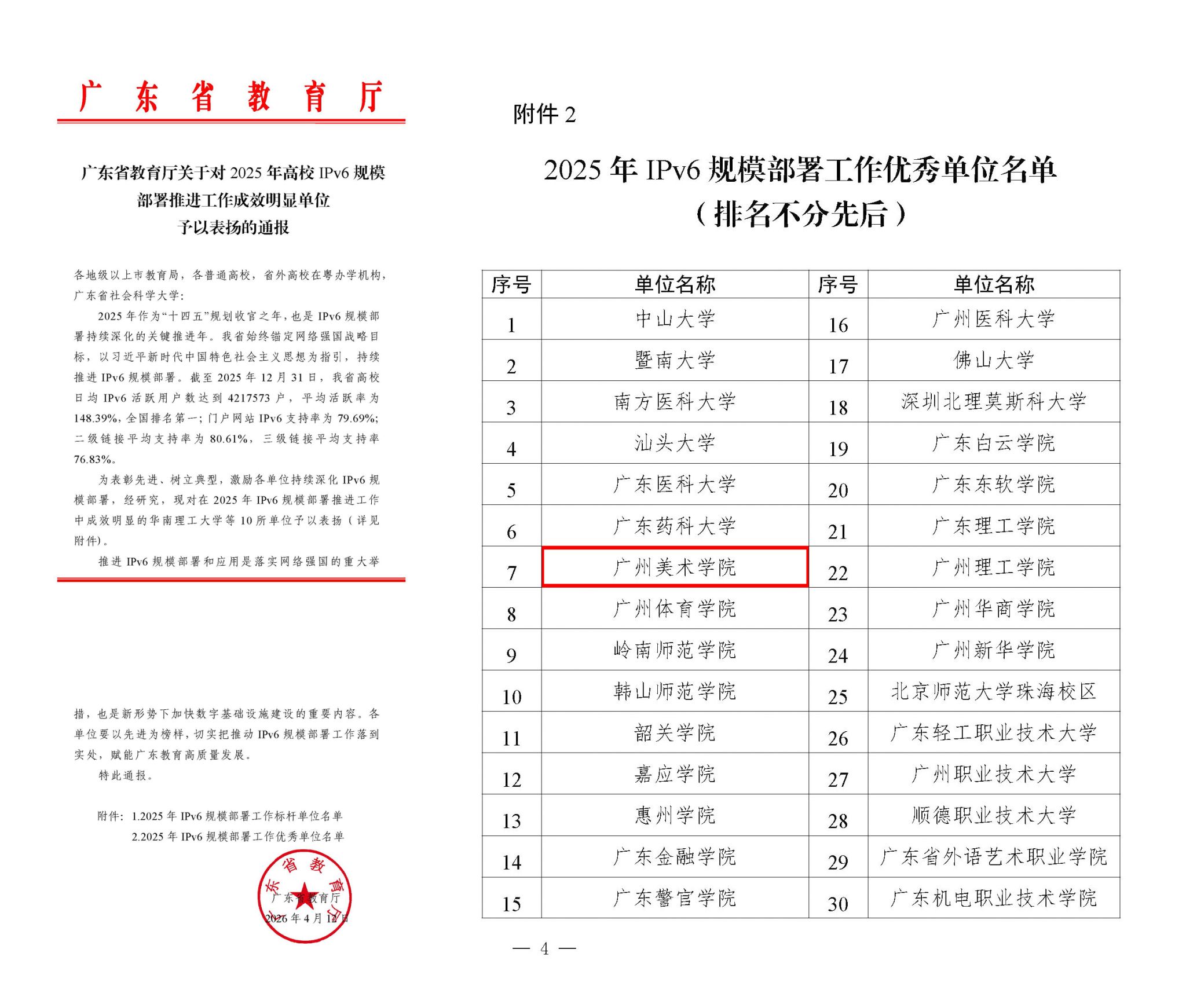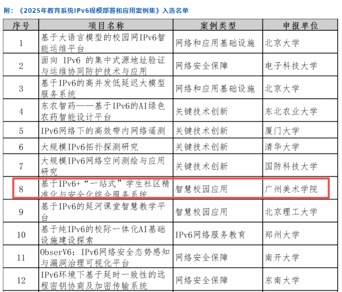 近日,广东省教育厅公布2025年高校IPv6规模部署工作考评结果。我校凭借在IPv6技术应用与基础设施升级等方面的突出表现,获评2025年高校IPv6规模部署工作优秀单位这是连续三年获此殊荣。
